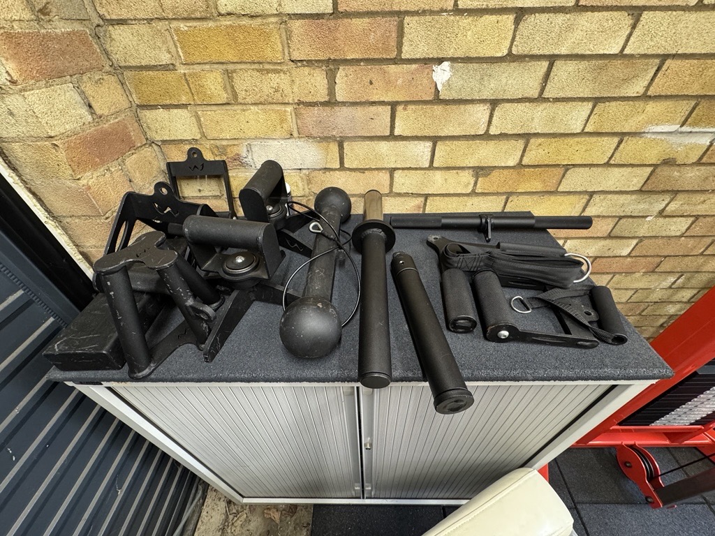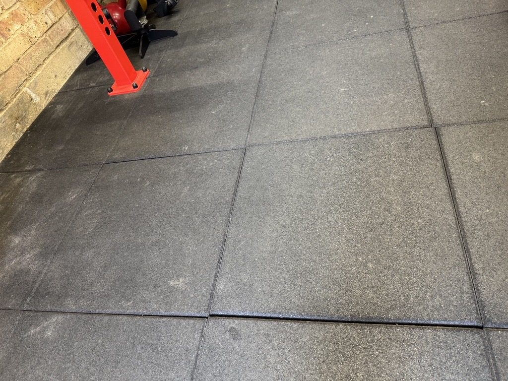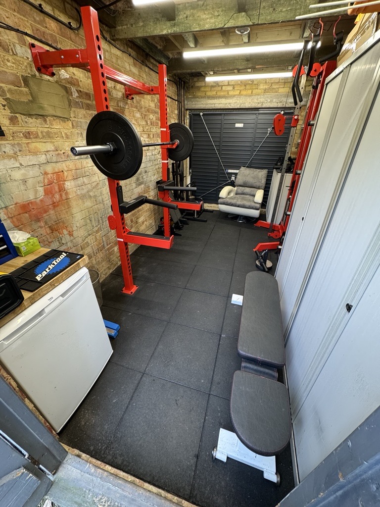 I use Cannon’s Luna 40mm rubber mats on the ground, and then use BeFit flatline (from Cannons as well) 1m x 50cm 20mm rubber mats on top of a cabinet to quieten down and protect your kit like bars, clamps, etc. from scratches.