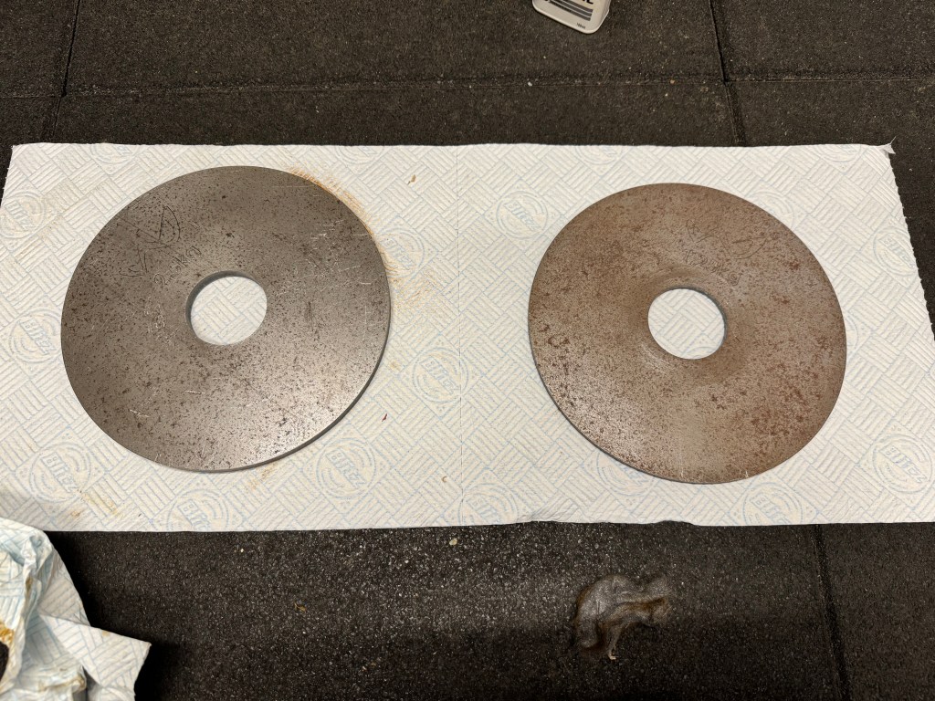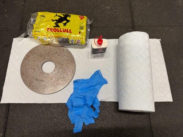 If like me your home gym is in the garage, where it gets cold and damp through the colder months, then you may want to wipe the top of the weights every so often (some of mine are stored horizontally). Rust will be more prevalent on the top as water moisture will land on top more often and in greater quantities. And it’s the same approach as above. Wire wool, a spot of oil, and a quick scrub.