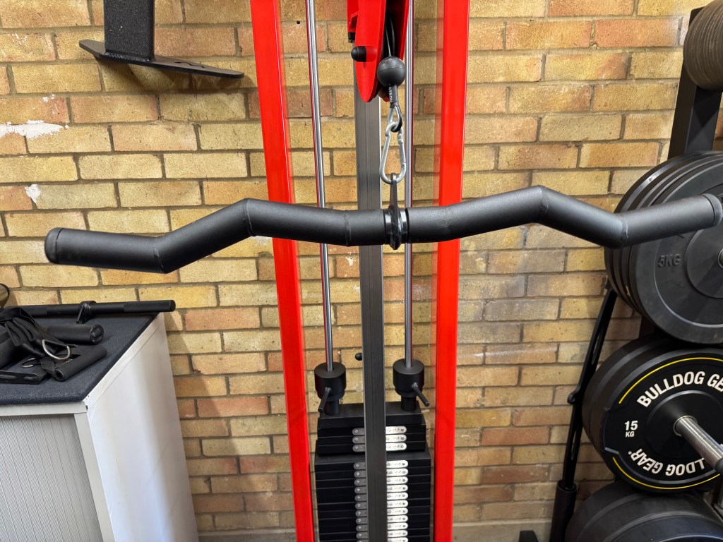 | How it attaches | Easily – it being lighter and narrower, it’s much easier to hold and attach | The weight and size make the bar awkward to position and clamp. I usually move the adjustable pulley to the lowest setting and attach from the floor |